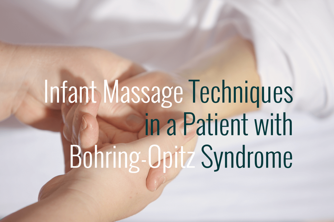 The boy, born after 32 weeks of pregnancy, exhibited typical characteristics of Bohring-Opitz Syndrome: chronic respiratory problems and infections, nutritional problems, epilepsy and prolonged sedation wean. The doctors gave infant massage about 15 minutes a week on hands and feet, with the aim of lowering the heart rate. A reduced heart rate was measured after all massage sessions. The massage, given over a period of 3 months, decreased non-purposeful body movements, increased tactile orientation as well as improved nutritional intolerance and resulted in a timely discharge from the hospital.